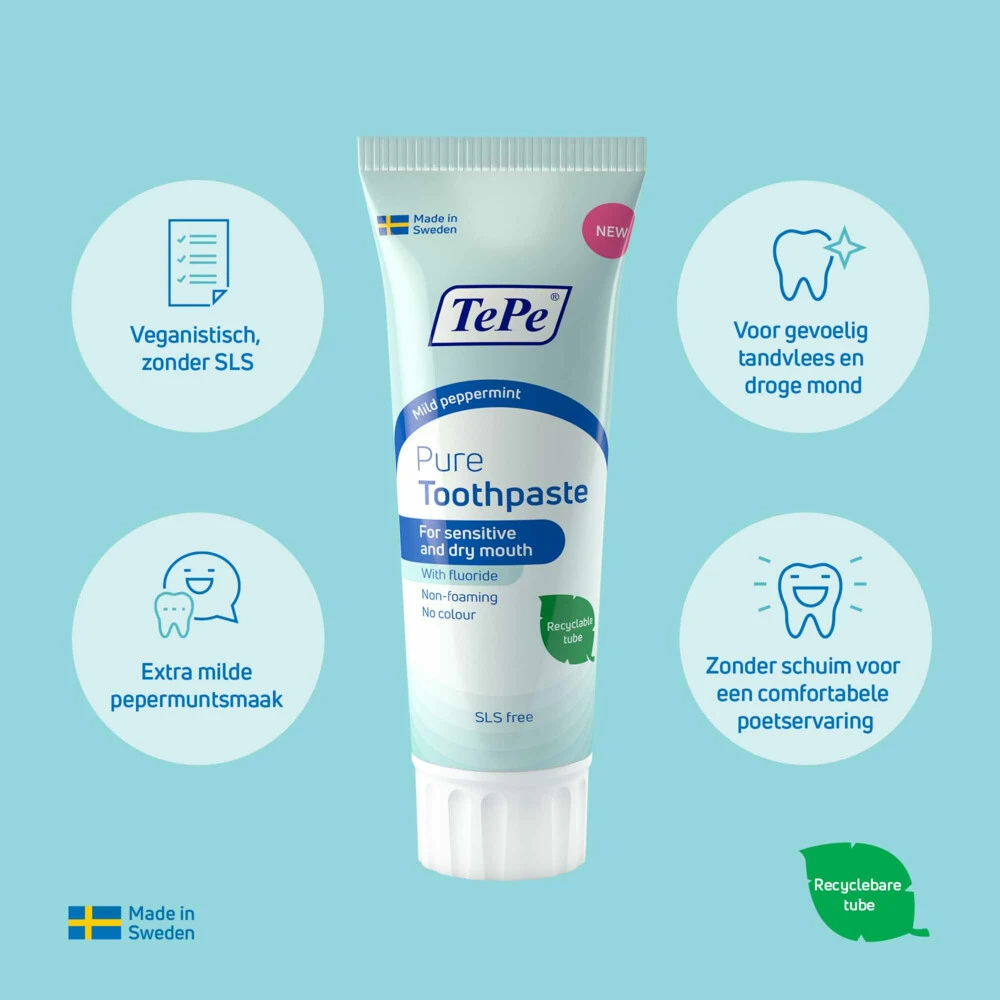 TePe Pure Tandpasta Mild PeppermintTePe Pure TePe Pure tandpasta is een milde tandpasta die speciaal ontworpen is voor mensen met gevoelig tandvlees en/of die de voorkeur geven aan een milde, niet-schuimende tandpasta. De tandpasta heeft een extra milde pepermunt smaak en bevat 1450 ppm fluoride om gaatjes te helpen voorkomen. TePe Pure tandpasta bevat geen schuimmiddel, geen kleurstof, geen microplastic en is vrij van natriumlaurylsulfaat (SLS), een schuimmiddel dat gevoelig mondweefsel kan irr