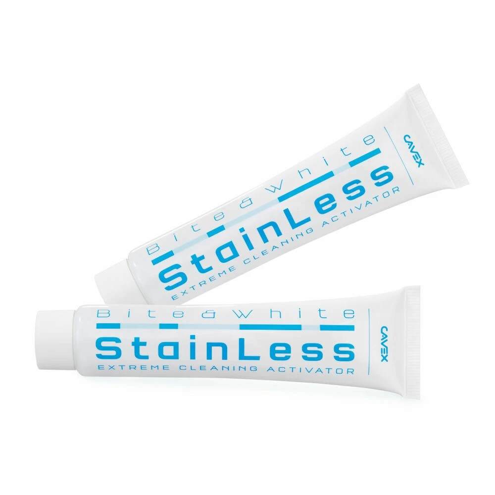 Cavex Bite&White Stainless tandpastaDeze Cavex Bite& White stainless tandpasta heeft een dubbele werking en is ontwikkeld voor het realiseren van een optimaal whitening resultaat.Reinigt extra grondig en verwijdert vlekken van de tanden;Veilig voor glazuur en dentine;Verhoogt pH van elementen en mond. Hierdoor krijgt de bleekgel een boost en is het eindresultaat optimaal;Langdurige en verrassend frisse smaak;Niet voor dagelijks gebruik.