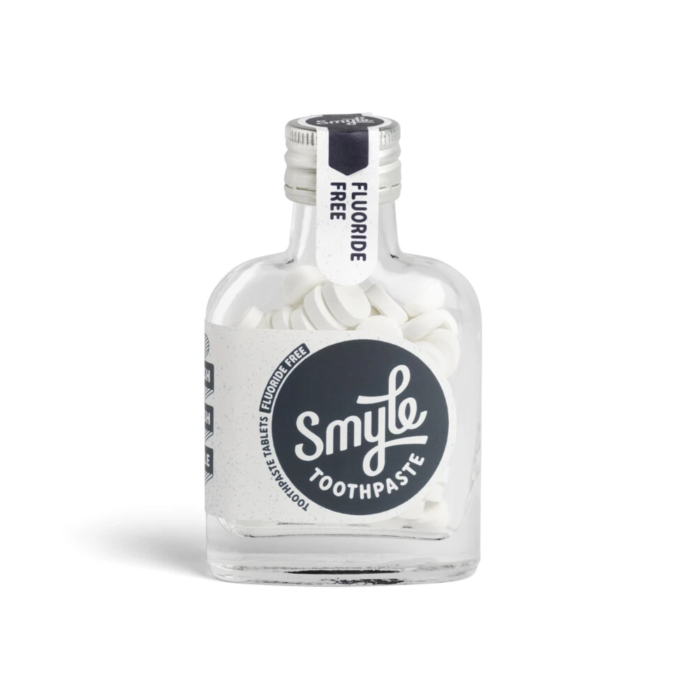 Smyle Tandpasta Tabletten Zonder Fluoride StartpakketDe Smyle Tandpasta Tablet Zonder Fluoride Startpakket zijn duurzame tandpasta tabletten gemaakt van natuurlijke ingrediënten in een milieuvriendelijke flesverpakking. Alle producten van Smyle zijn geheel plasticvrij. Je kan deze fles makkelijk navullen met de navulverpakking van Smyle. De tabletten bestaan uit eucalyptus, aloë era en calcium carbonate, zijn heel makkelijk te gebruiken en het zorgt voor heerlijke frisse tanden!Duurzam
