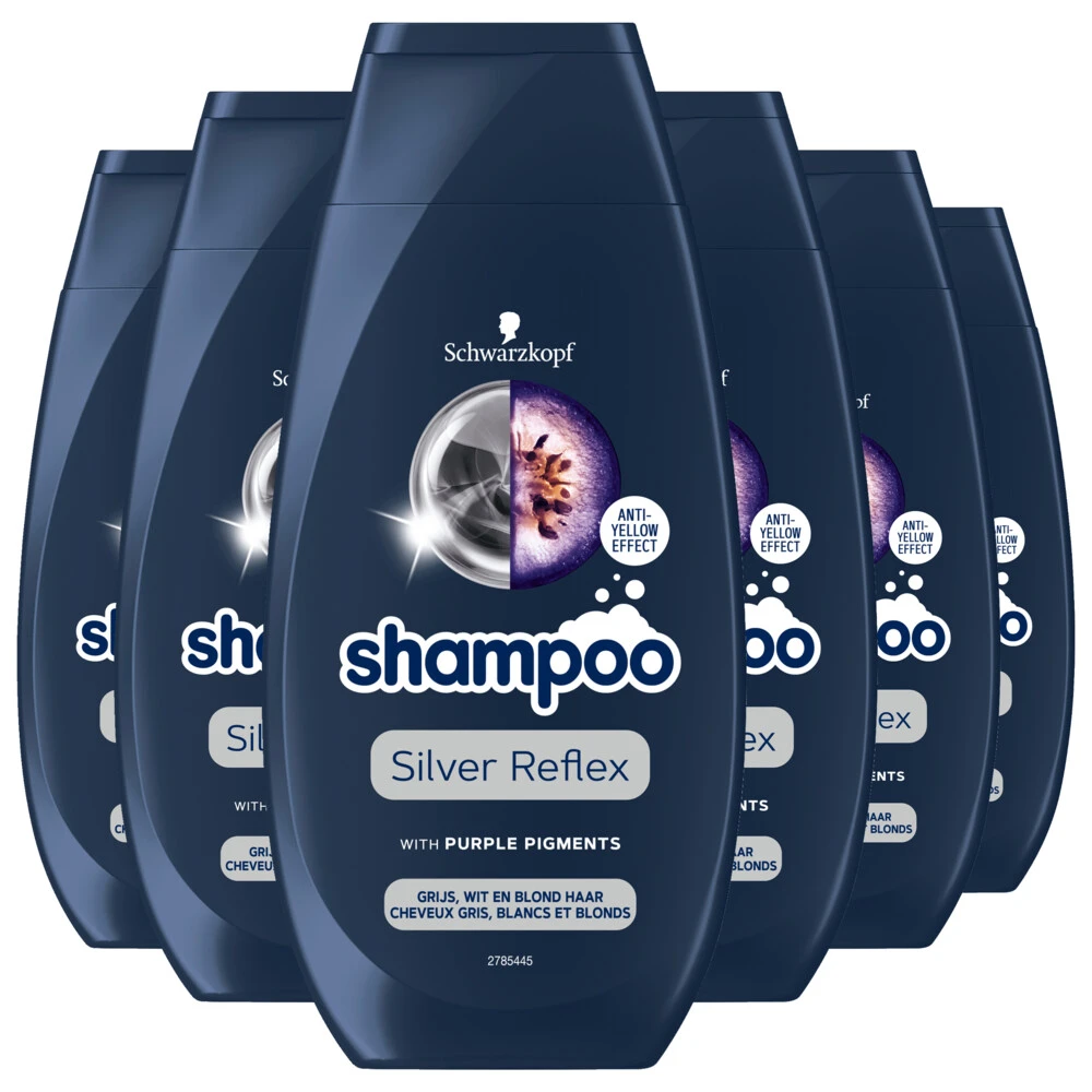 Schwarzkopf Silver Reflex ShampooDe Silver Reflex shampoo bevat paarse pigmenten en geeft een anti-geel effect aan het haar. De formule is vegan en beschermt tegen vervaging en verkleuring. Geschikt voor blond, grijs &  wit haar. De shampoo neutraliseert de gele gloed uit blond, grijs of wit haar.De formule versterkt en voedt het haar tot in de punten.De shampoo bevat paarse pigmenten.Zorgt voor een anti-geel effect.Alle shampoos van Schwarzkopf zijn vegan.De fles is gemaakt van 50