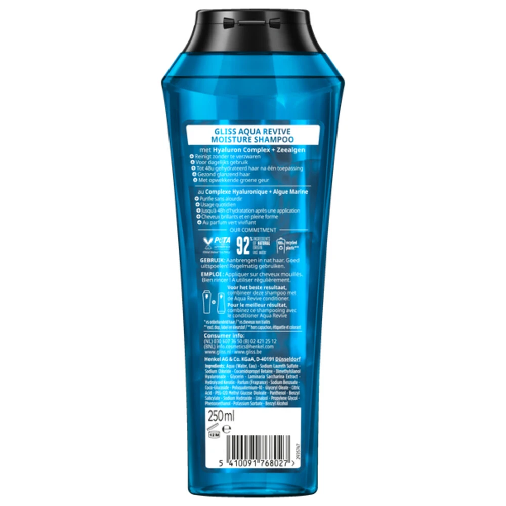 Gliss Aqua Revive ShampooGliss Kur Aqua Revive Shampoo is een hydraterende shampoo die speciaal is ontwikkeld om droog en beschadigd haar te herstellen. De formule bevat een unieke mix van vochtinbrengende ingrediënten die het haar intensief voeden en hydrateren, terwijl het haar tegelijkertijd wordt gereinigd.Speciaal ontwikkeld voor droog en beschadigd haarBevat vochtinbrengende ingrediënten om het haar intensief te voeden en hydraterenReinigt het haar grondig terwijl het wordt herst