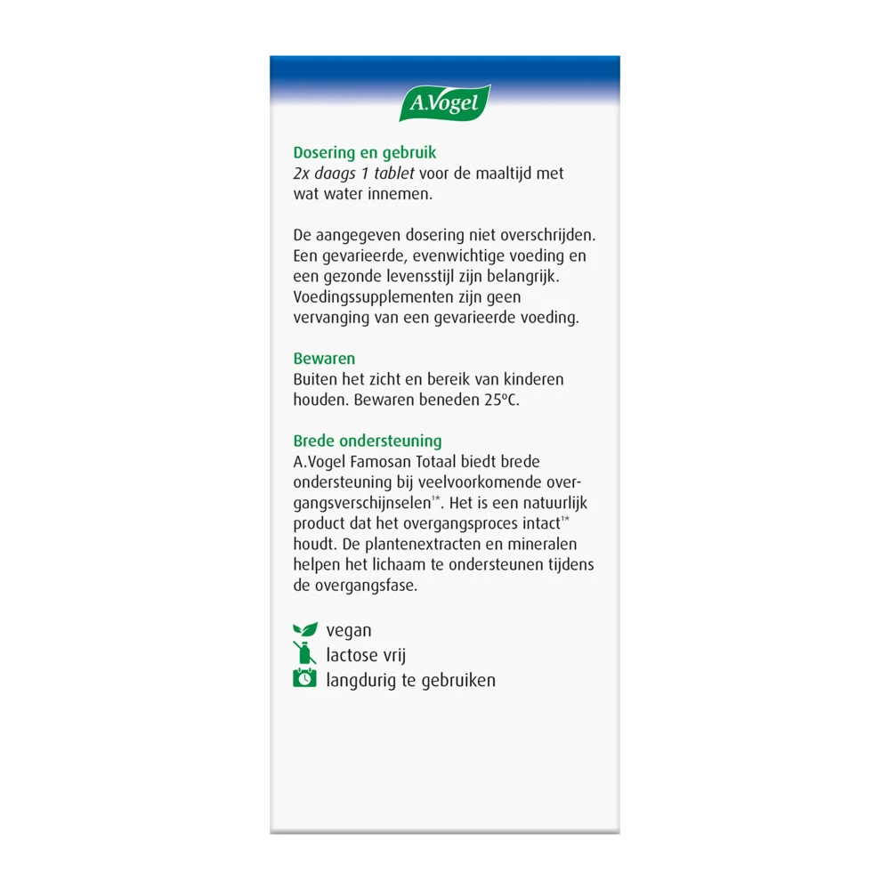 Vogel Famosan Overgang bij Stemmingswisselingen1*Famosan Totaal Stemmingswisselingen1* van A.Vogel is een krachtige formule voor vrouwen in de overgang. Deze krachtige formule heette voorheen Famosan Totaal. Famosan Famosan Stemmingswisselingen 1* geeft een brede ondersteuning bij meerdere overgangsverschijnselen1*. Naast stemmingswisselingen helpt het ook bij opvliegers, nachtzweten en de lichamelijke overgangsverschijnselen zoals een droge huid, ogen, mond, vagina2* en vermoeidheid3*. Cim