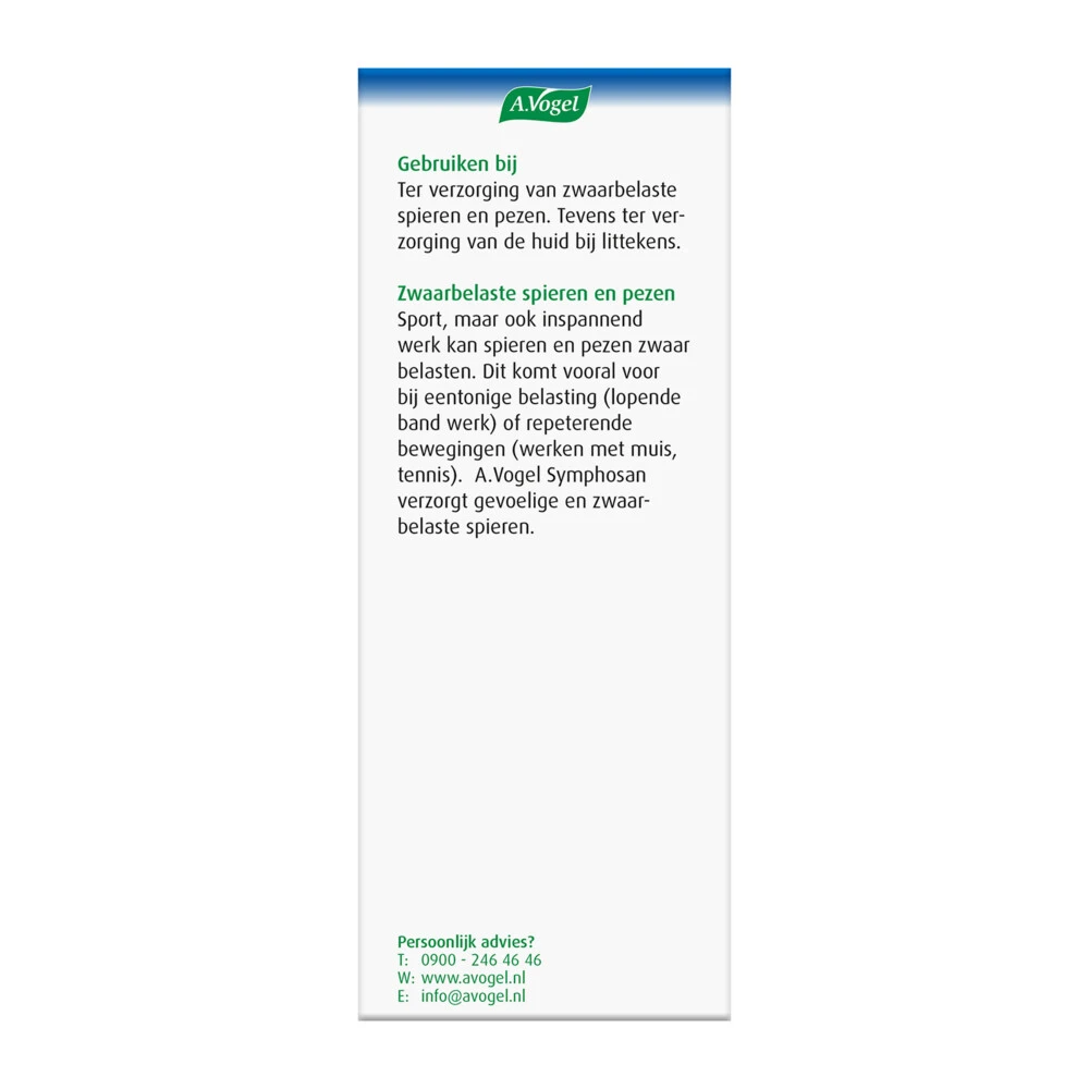 A.Vogel Symphosan Spieren en PezenSymphosan van A.Vogel is voor uitwendig gebruik en verzorgt zwaarbelaste spieren en pezen. De spieren kunnen (zwaar)belast worden door dagelijks werk, sporten of inspanningen die je niet bent geweend om te doen. Naast de verzorging van de spieren heeft Symphosan ook een huidherstellende werking waardoor je Symphosan ook kunt gebruiken bij de verzorging van littekens.De bijzondere eigenschappen van Symphosan op een rij:Ter verzorging van overbelaste pezen en spie