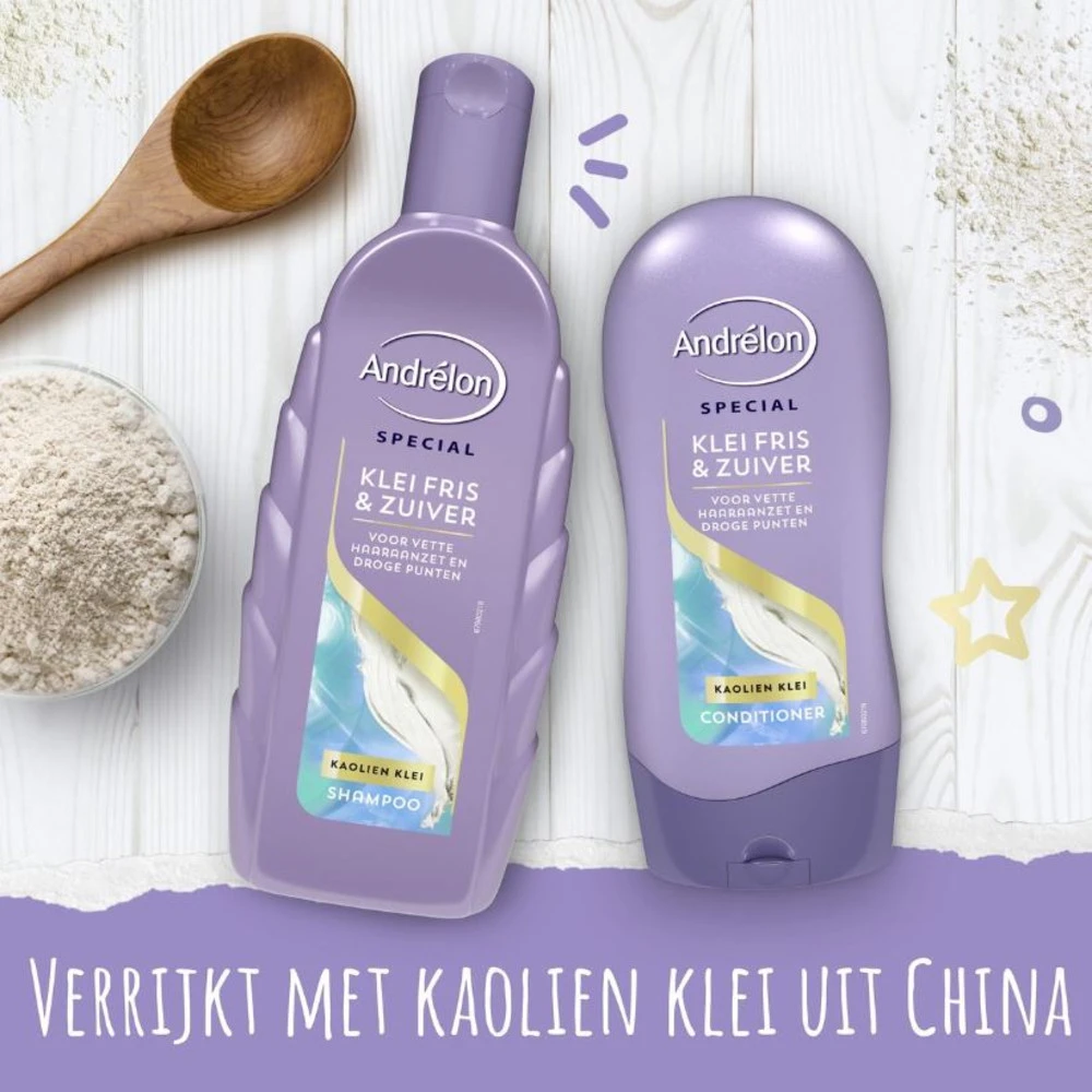 Andrélon Klei Fris & Zuiver Shampoo + Conditioner PakketIn dit voordeel pakket van Andrélon Klei Fris & Zuiver heb je alles wat je nodig hebt voor de verzorging van jouw haar. In dit pakket zit de Andrélon Klei Fris & Zuiver Shampoo en Conditioner. De shampoo en conditioner zijn speciaal ontwikkeld voor haar dat snel vet wordt bij de haaraanzet en droog is in de punten.De Andrélon Shampoo & Conditioner Klei Fris & Zuiver is verrijkt met kaolienklei