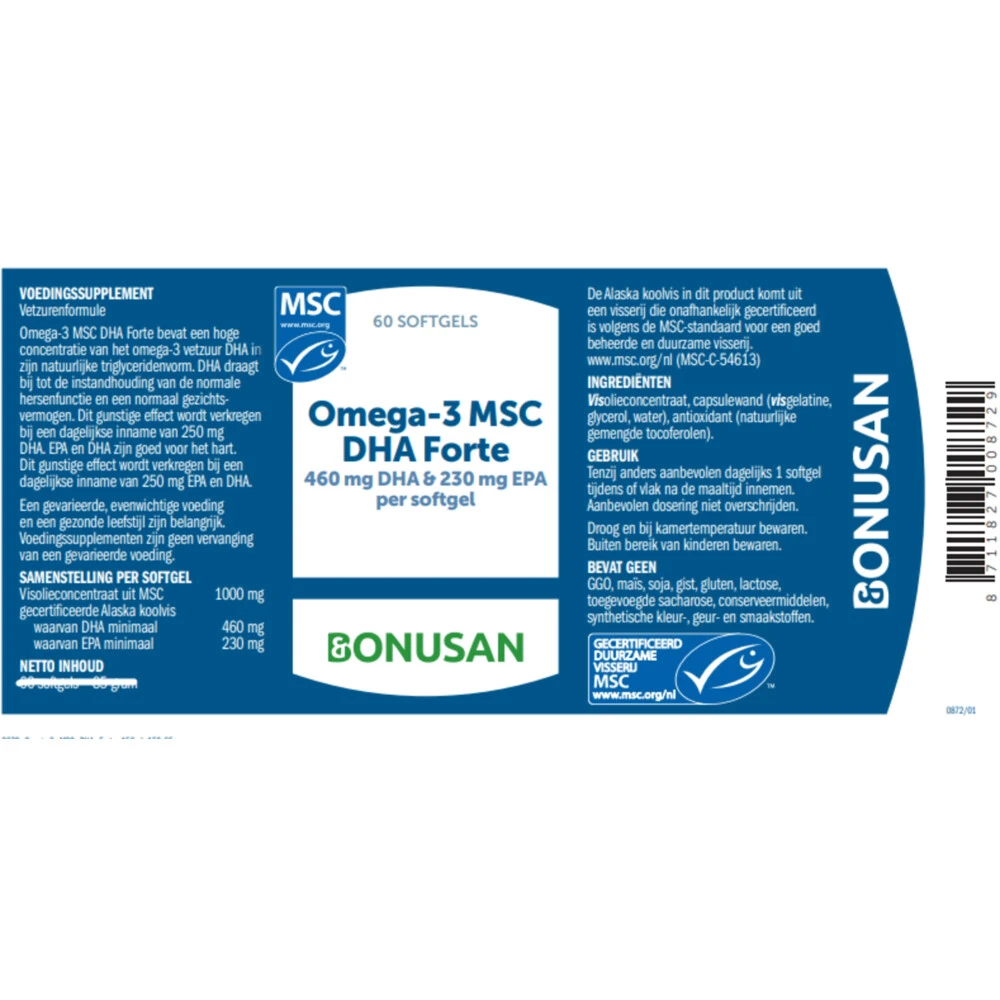 Bonusan Omega 3 MSC DHA ForteBonusan Omega 3 MSC DHA Forte bevat omega-3 in triglyceridenvorm, dit is de natuurlijke vorm zoals in ons voedsel en wordt daardoor goed opgenomenOmega-3 vetzuren, waar DHA deel van uitmaakt, zijn een groep met meervoudig onverzadigd vetzuren en belangrijke bouwstoffen voor het menselijk lichaam. Bonusan Omega 3 MSC DHA Forte bevat 460 mg DHA én 230 mg EPA per softgel. DHA en EPA zijn goed voor het hart* en houden de normale bloeddruk** in stand DHA is ee