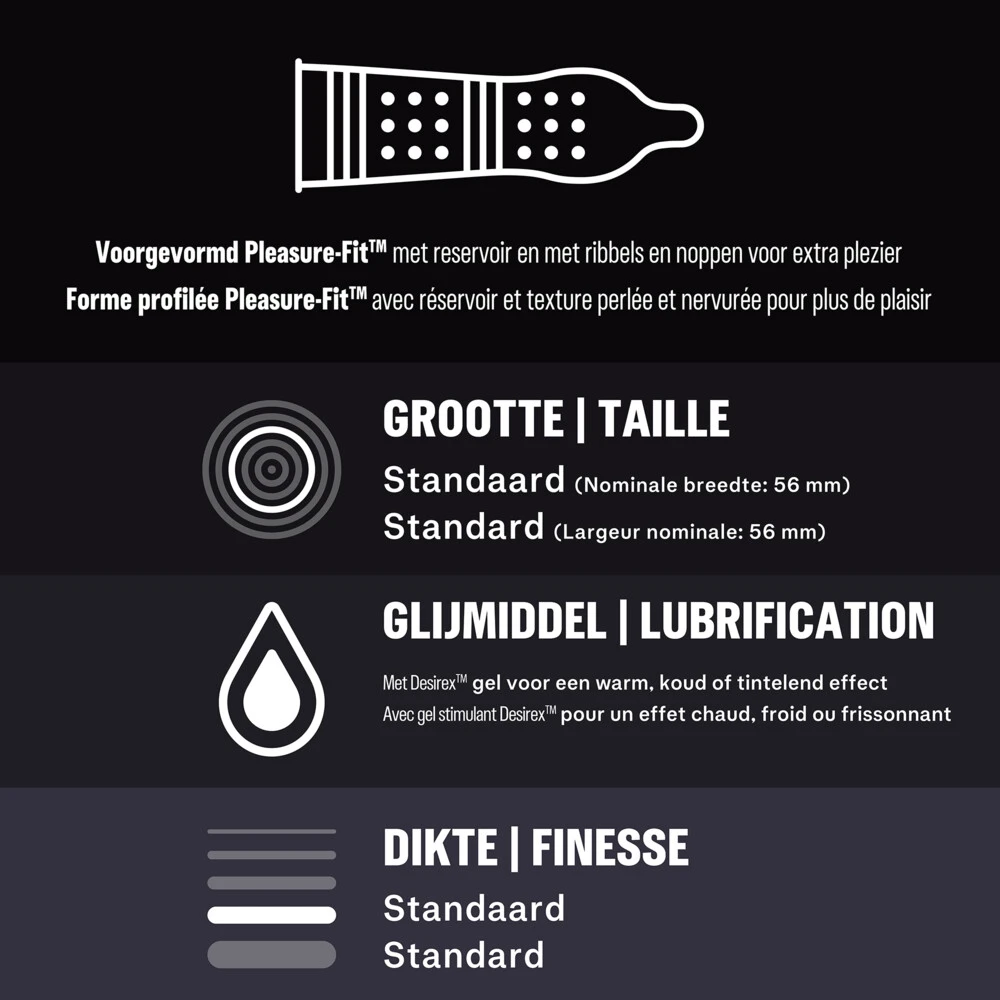 Durex Orgasmu0027Intense PakketDe Durex Orgasm’Intense-condooms zijn ideaal om je partner nog intenser te laten genieten. De ribbels en nopjes zorgen voor extra stimulatie en de condooms zijn voorzien van een speciaal glijmiddel met een warm, koud of tintelend effect dat je partner een nog intenser orgasme zal bezorgen. Perfecte sensatie: condooms met durex desirextm gel, voor een verwarmende, verkoelende of tintelende sensatie.Extra stimulerend: stimulerende textuur met ribbels en n