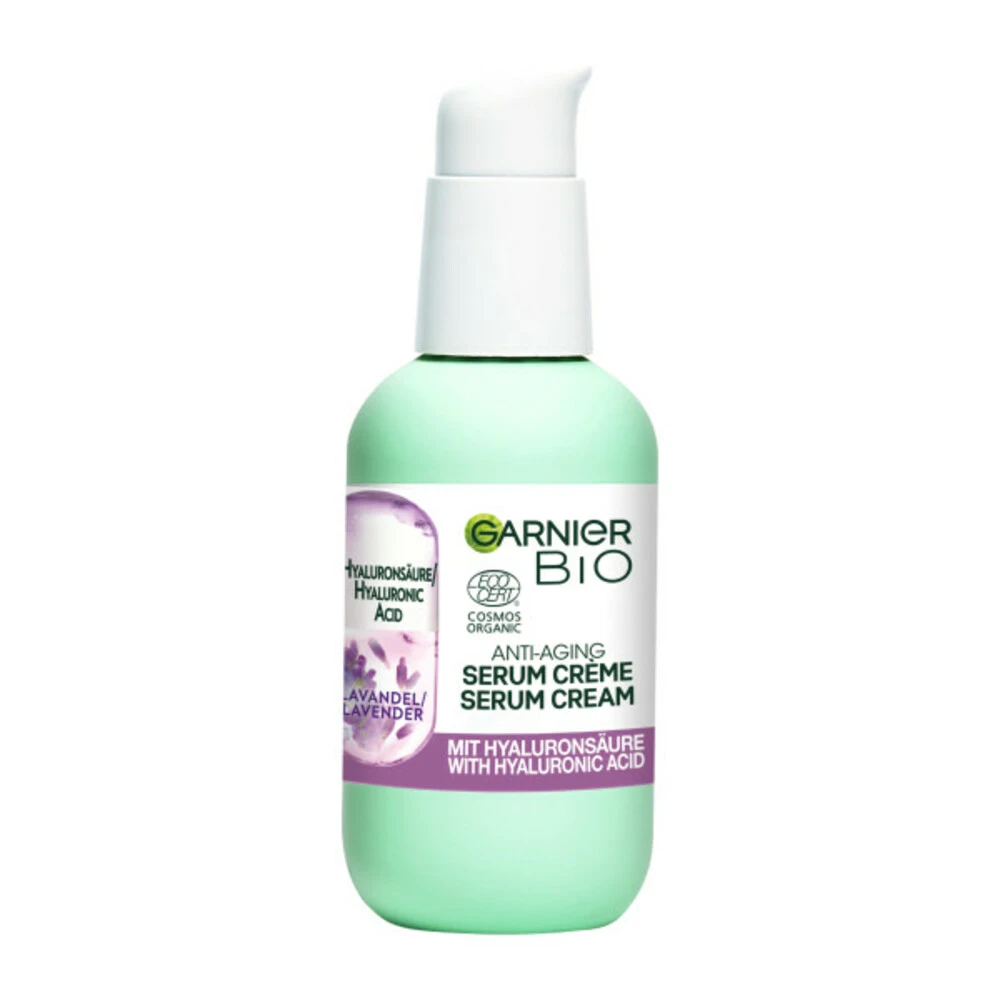 Garnier Bio Anti-Aging Serum Cream LavendelGarnier Bio Anti-Aging serum cream met Hyaluronzuur combineert de anti-aging eigenschappen van een serum met hyaluronzuur met de hydraterende werking van een dagcrème tegen fijne lijntjes. Dermatologisch getest en geschikt voor de gevoelige huid.Serum creamHyaluronzuurAnti-agingVermindert fijne lijntjes