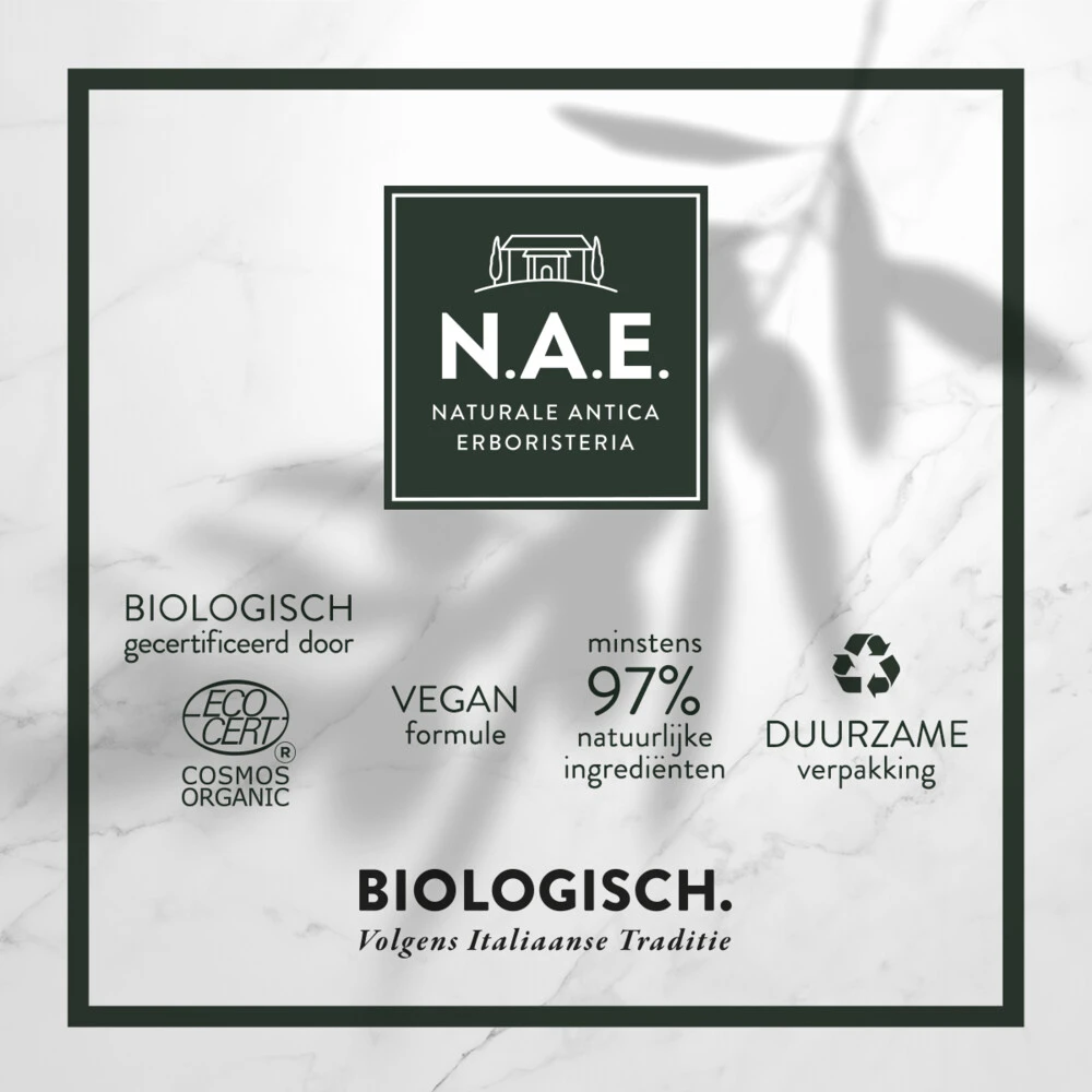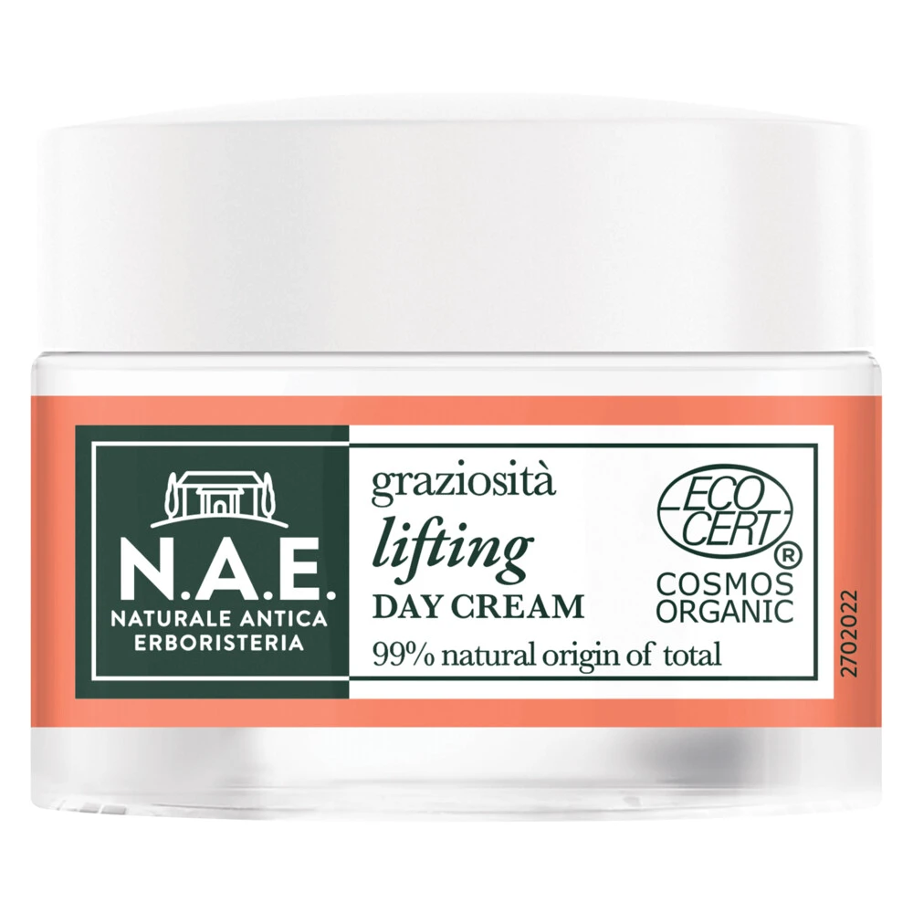 N.A.E. Graziosità Lifting Anti-Age Dagcrème 50 mlN.A.E. Lifting Day Cream vult en verzacht rimpels, voor een jonger uitziende huid.Door de combinatie van bio-roosbottelolie en bio-sinaasappelschil-extract maakt onze bio-gecertificeerde dagcrème rimpels zichtbaar glad. Dankzij het effectieve hyaluronzuur wordt de huid tot 48 uur gehydrateerd. Voor een gelifte en vollere huid al na de 1e toepassing. Deze liftende dagcrème is COSMOS Organic gecertificeerd door Ecocert Gr