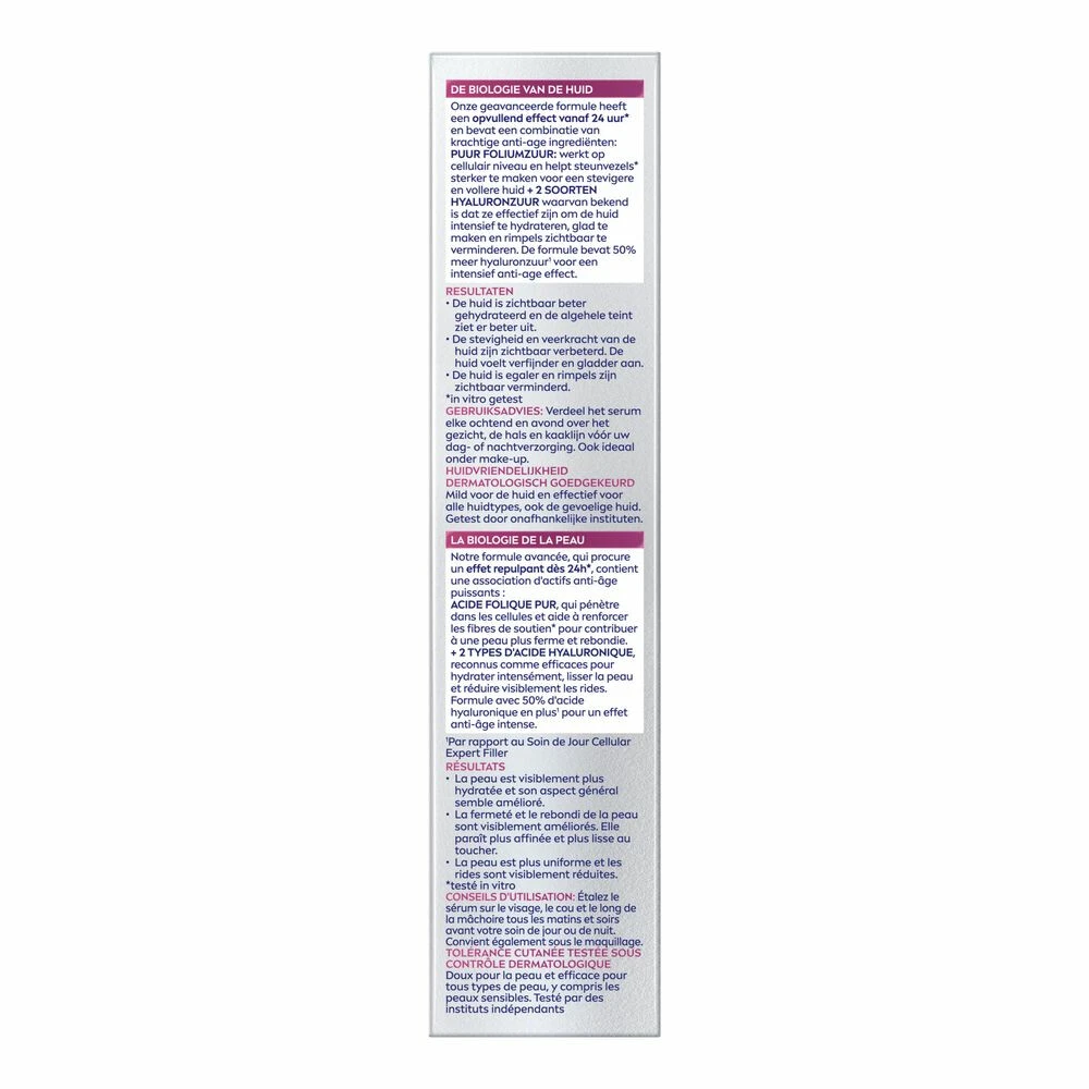 Nivea CELLular Hyaluron Anti-Age Verstevigend SerumNivea Cellular Expert Filler Anti-Age Serum heeft een opvullend effect vanaf 24 uur* en bevat een combinatie van krachtige anti-age ingrediënten. Het ingrediënt Puur Foliumzuur werkt op cellulair Niveau en helpt steunvezels* sterker te maken voor een stevigere en vollere huid. De twee soorten Hyaluronzuur zijn effectief om de huid intensief te hydrateren, glad te maken en rimpels zichtbaar te verminderen. De formule bevat 50% meer Hyal