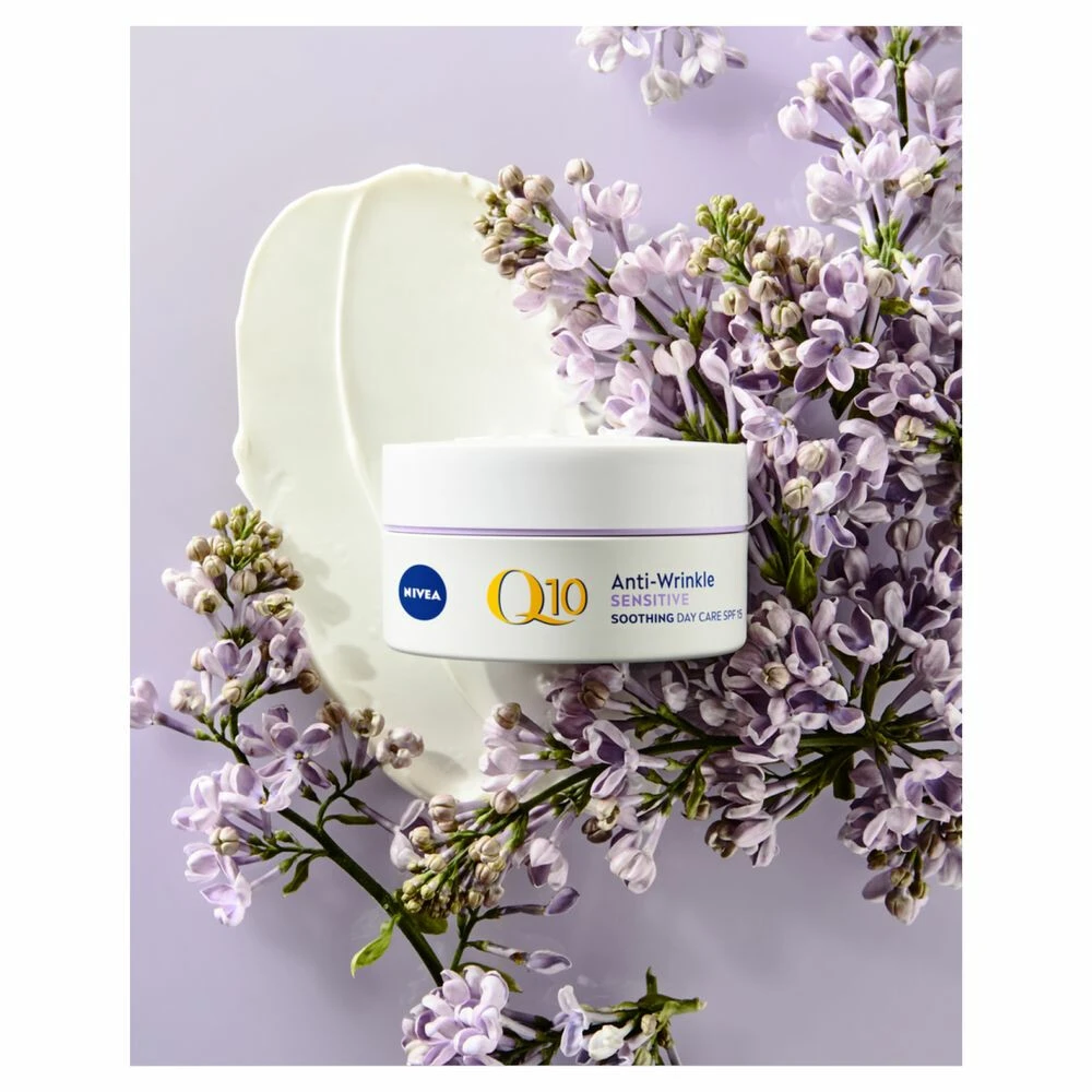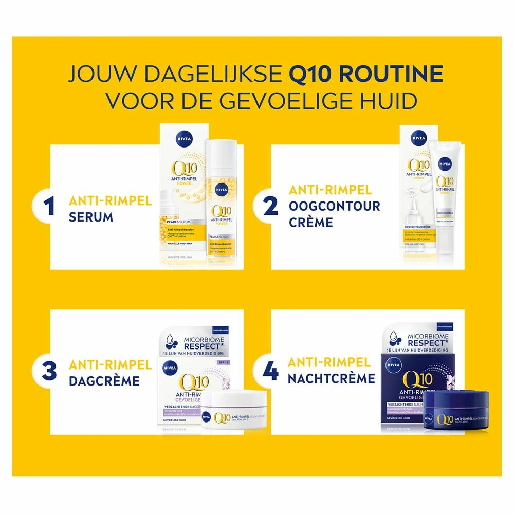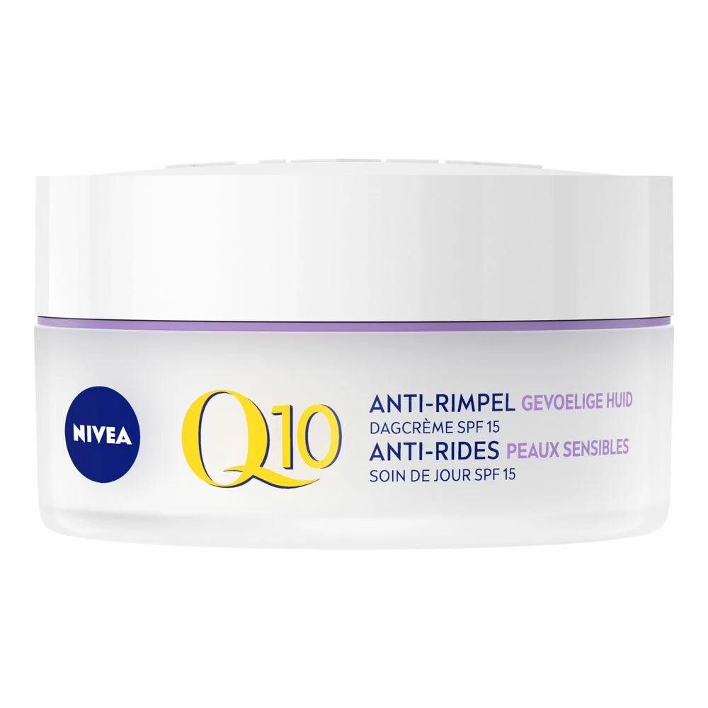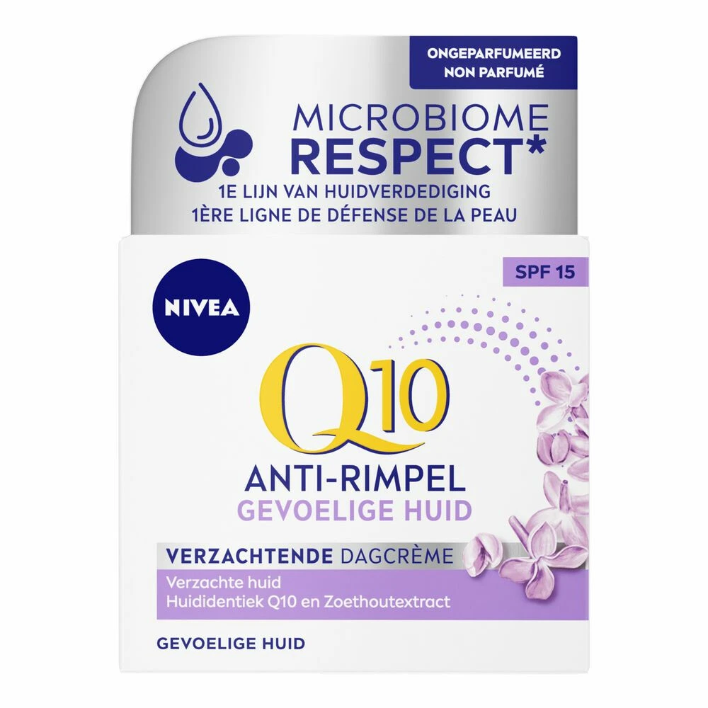 Nivea Q10 Power Sensitive Dagcreme met SPF15Nivea Q10 Power Anti-Rimpel Verzachtende Dagcrème SPF15 heeft een bewezen 24u anti-rimpel werking voor de gevoelige huid. Het microbioom van de huid is als een u0027onzichtbare laagu0027 van natuurlijke bacteriën op het huidoppervlak. Het evenwicht is essentieel om de gezondheid en kracht van de huid te behouden. Deze dagcrème respecteert het microbioom en hydrateert de huid intensief om uitdroging, een trekkerig gevoel en roodheid