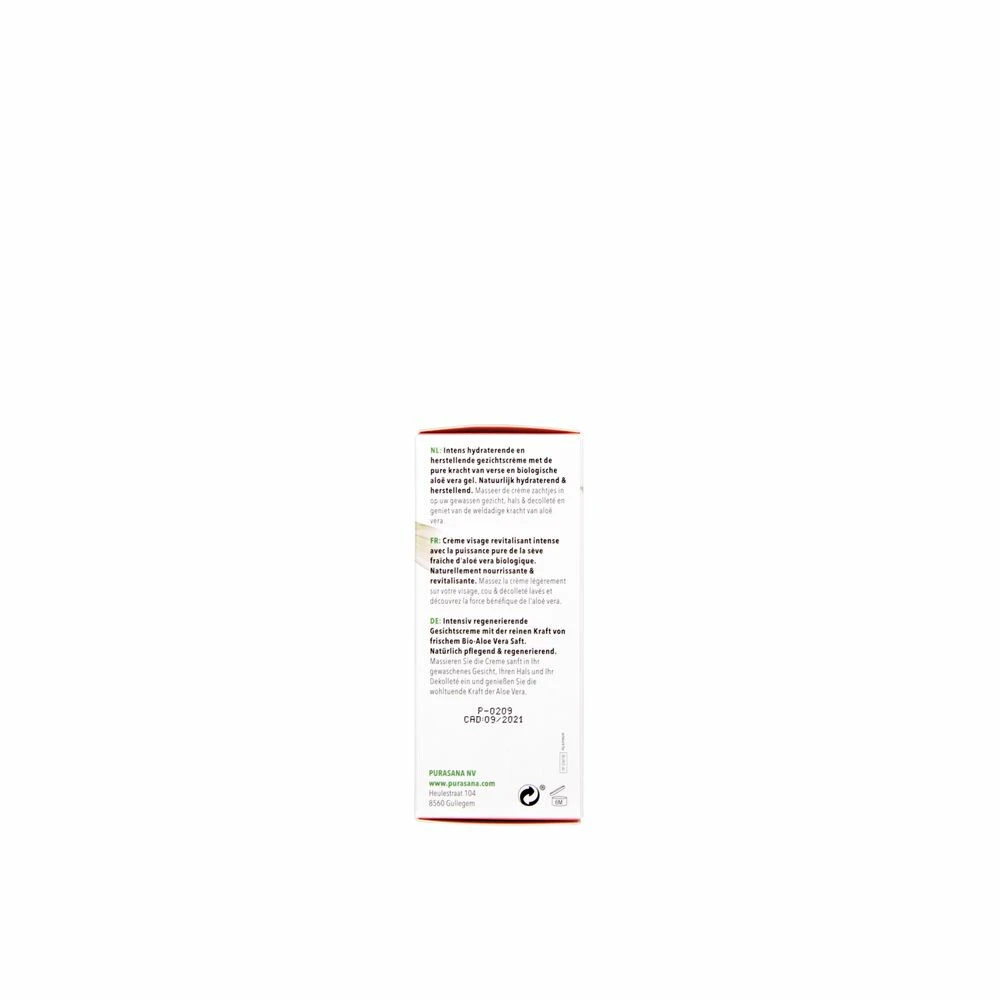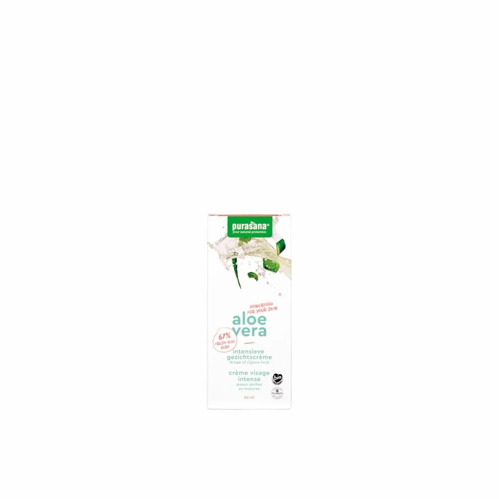 Purasana Aloë Vera Intensieve Gezichtcrème Bio De Purasana intensieve gezichtscreme met biologische aloe vera gel en actieve plantenextracten is een exclusief samengestelde formule voor de drogere, rijpere en veeleisende huid. Door de intensieve combinatie van aloe vera verrijkt met Gotu Kolaextract, argan en avocadoolie, krijgt de huid een krachtig en hydraterend herstel. Met 61% fresh Aloe Vera, de verzorgingscreme versterkt de huidbarriere, behoudt de juiste vet en vocht
