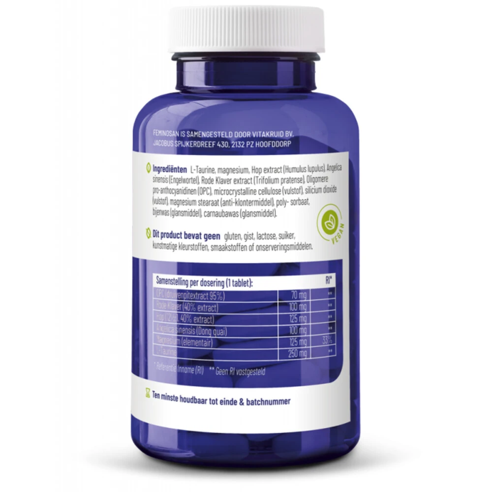 Vitakruid FeminosanVitakruid Feminosan is voor vrouwen die in de overgang komen, de overgang is een periode in het leven van de vrouw waarin de hormoonhuishouding een nieuw evenwicht moet vinden. Elke vrouw ervaart dit op een andere manier, maar lichamelijke veranderingen zijn vaak tekenend voor deze tijd. Vitakruid Feminosan is ontwikkeld om deze periode dragelijker te maken. Door het samenvoegen van hoogwaardige extracten ondersteunt deze unieke formule het overgangsproces.**Â Ondersteunt